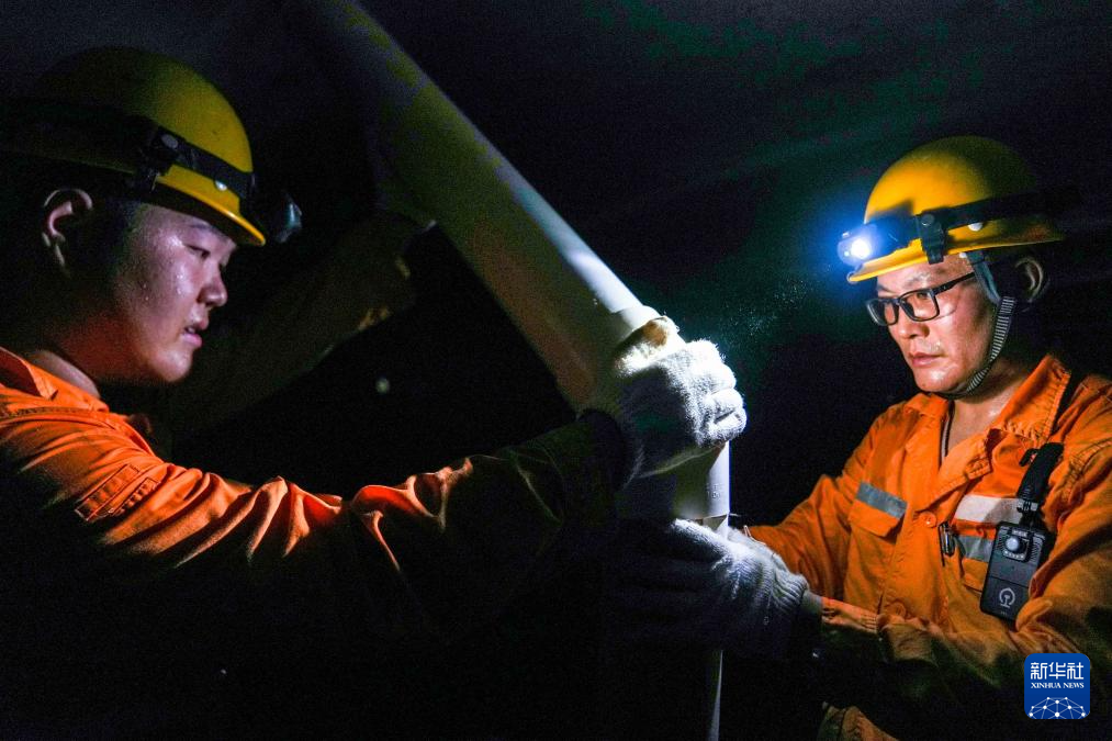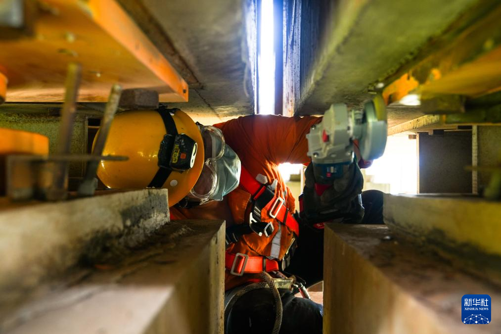 7月25日,工作人员在京沪高铁江苏南京段桥梁内部更换破损排水管。