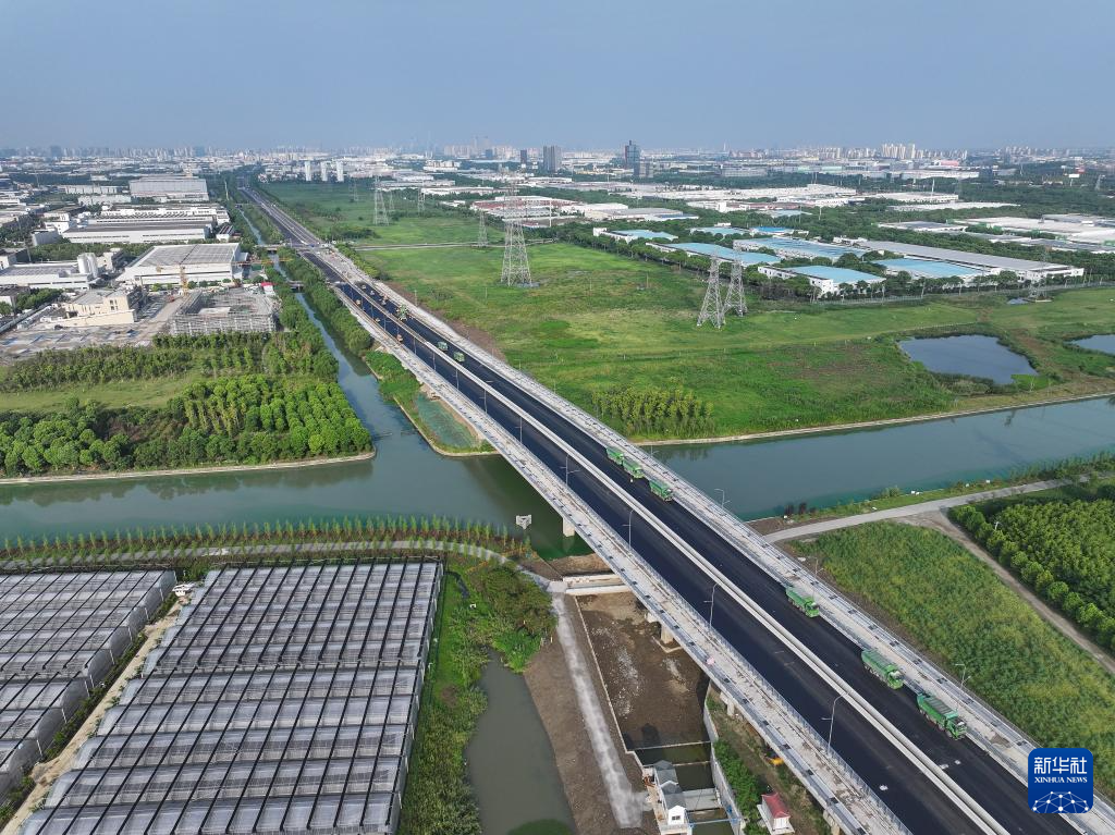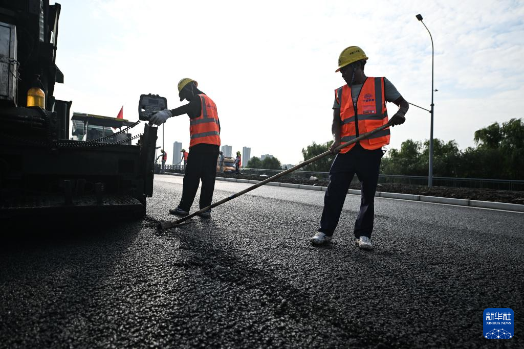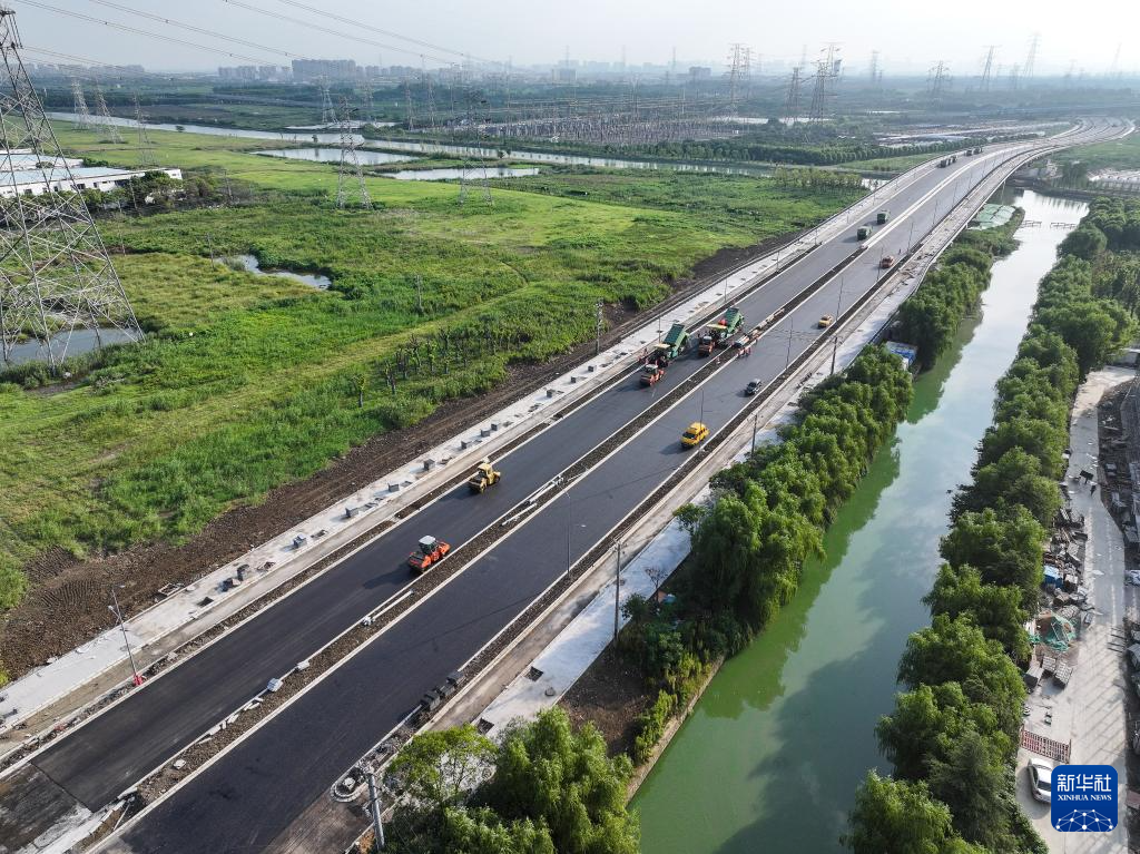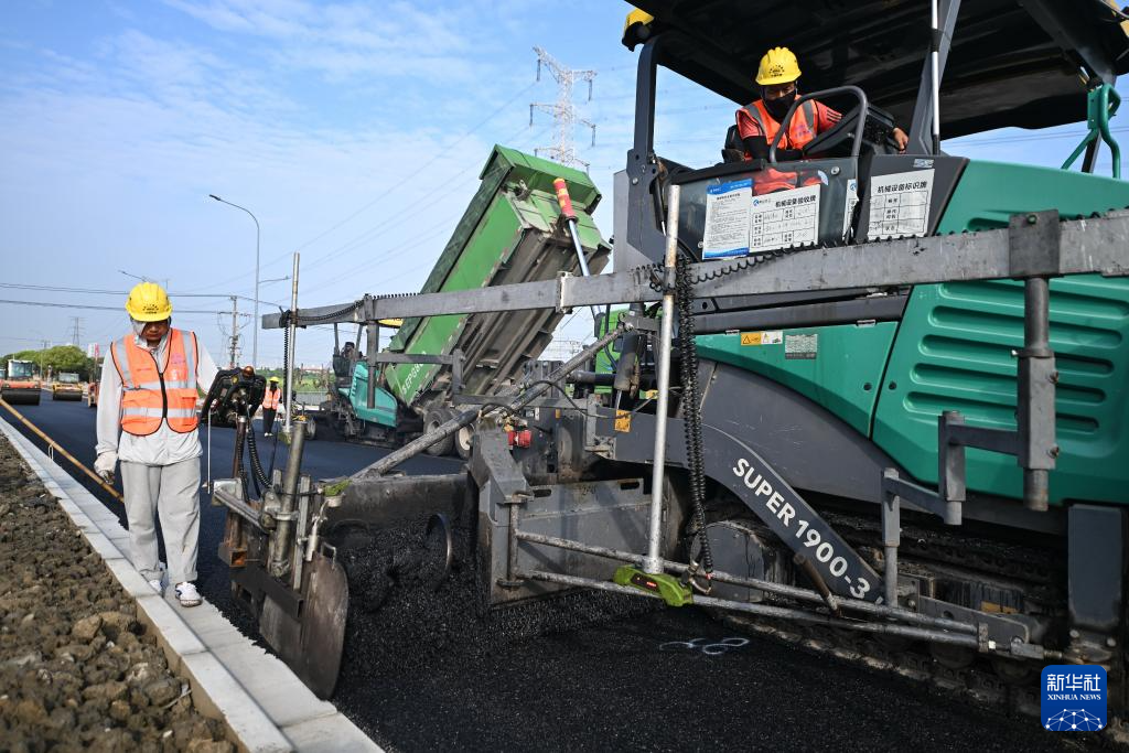 8月22日拍摄的苏州强胜路接312国道工程沥青路面摊铺施工现场(无人机照片)。