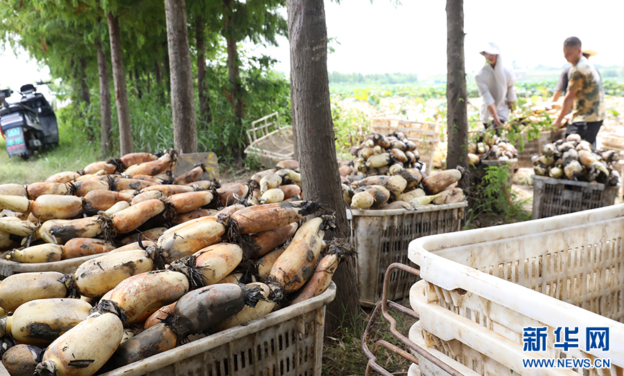 8月18日,在肥西县丰乐镇蒋岗村莲藕种植合作社基地内,农民在采收莲藕。