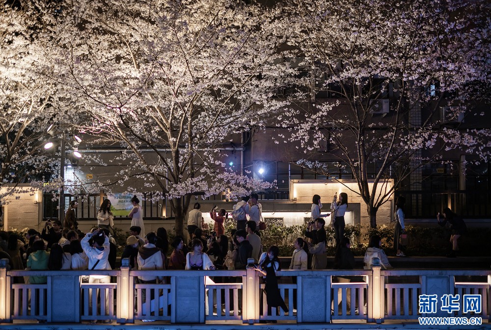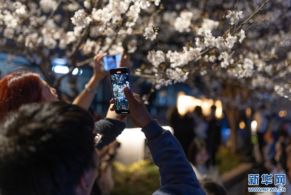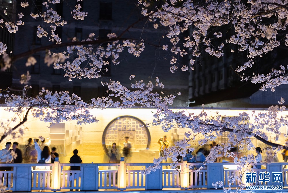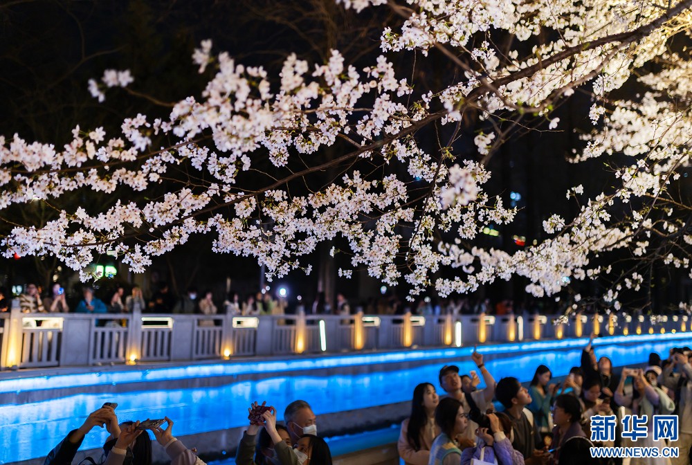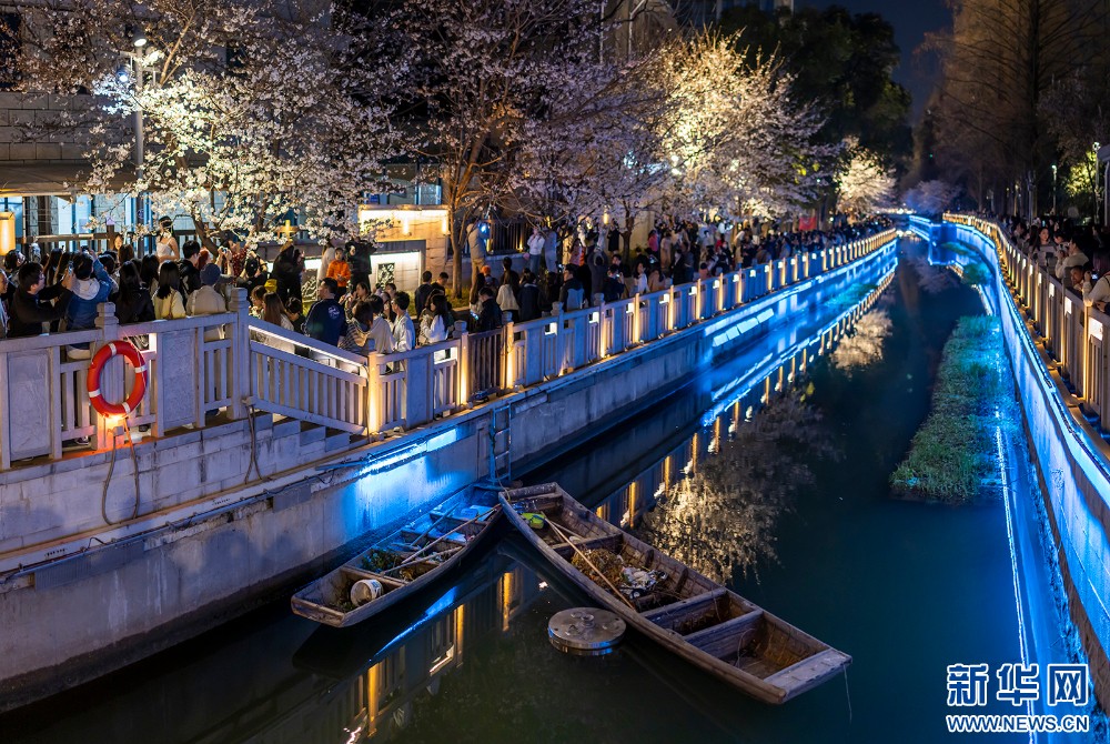 近日,南京四牌楼珍珠河畔边的樱花盛放,满树烂漫、灿若云霞。夜晚蓝色灯带亮起,照亮整条河流和花枝。微风吹拂,河畔两侧樱花随风飘落,吸引众多市民和游客前来夜赏樱花,感受别样浪漫。(沙芳如 报道员:刘伟)
