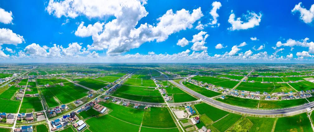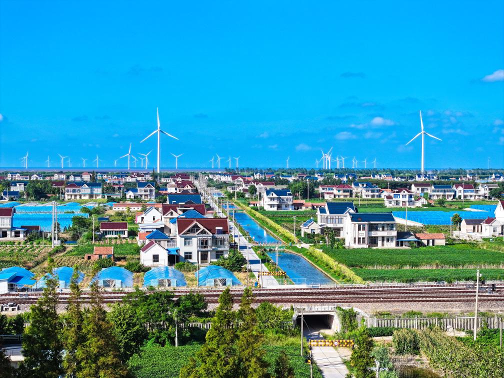 初秋时节,江苏省如东县境内的田野、道路与民居交相辉映,蓝天白云下,远处的风车缓缓转动,宛如一幅绚丽多彩的画卷。