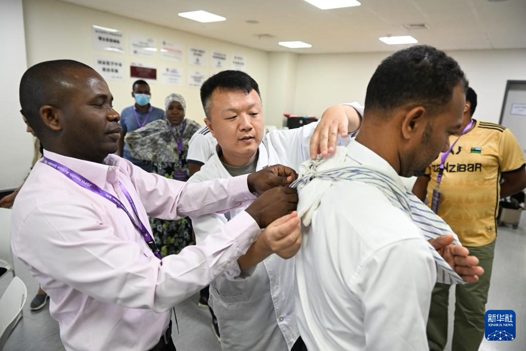 9月4日,江苏省人民医院医生袁超(前中)指导研修班学员进行上肢固定操作。