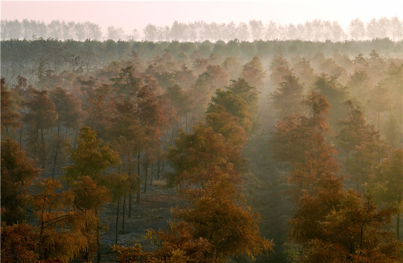 高邮经济开发区清水潭红杉林,清晨雾漫林间径,层林尽染入画中。刘春芬 摄