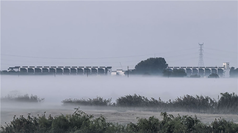 晨雾笼罩下的高邮湖漫水闸,勾勒出一幅云雾泼墨山水画卷,意境深远。张召朋 摄
