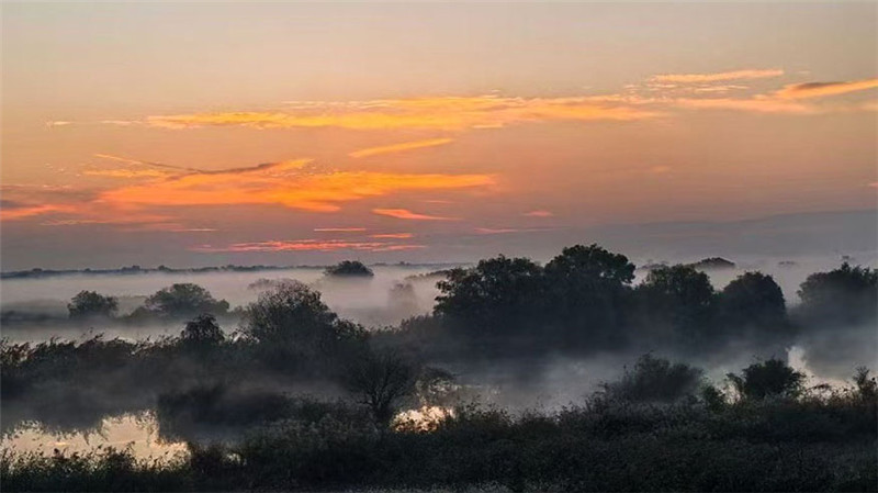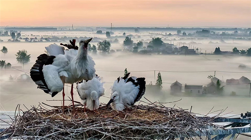 晨雾轻纱,缭绕乡间,伴随着朝阳升起,东方白鹳迎接着清晨的第一缕阳光。刘春芬 摄