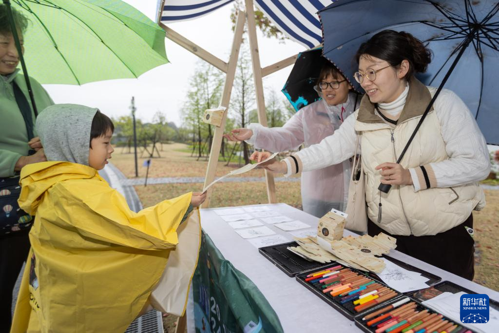 4月8日,一名小朋友在“爱鸟助飞”公益市集领取制作“鸟巢”的折纸。