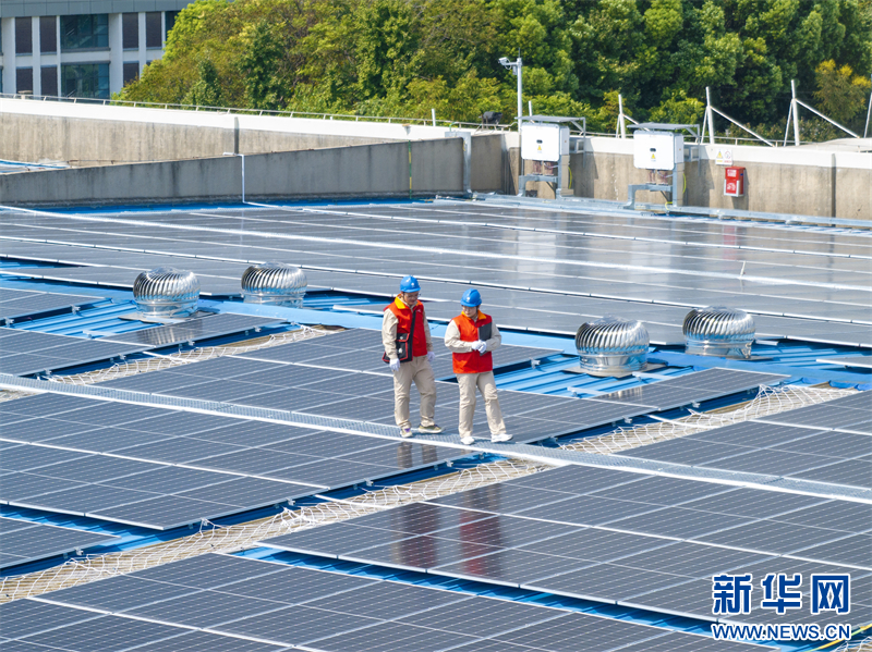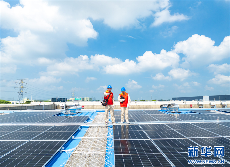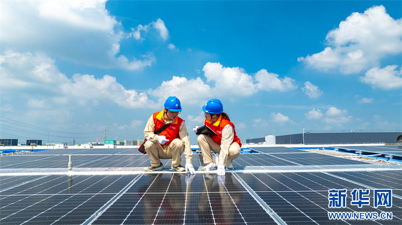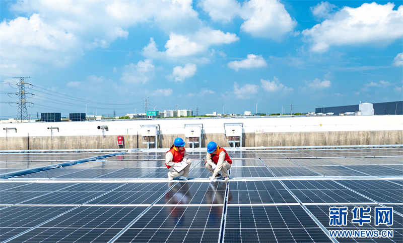近年来,江苏省兴化市推进工业园区屋顶分布式光伏发电项目建设,引导企业使用清洁能源、加快绿色转型升级。图为近日,国网江苏兴化市供电公司为当地一家企业检查光伏发电装置运行状况,确保安全运行。(沙佳仪 周社根)