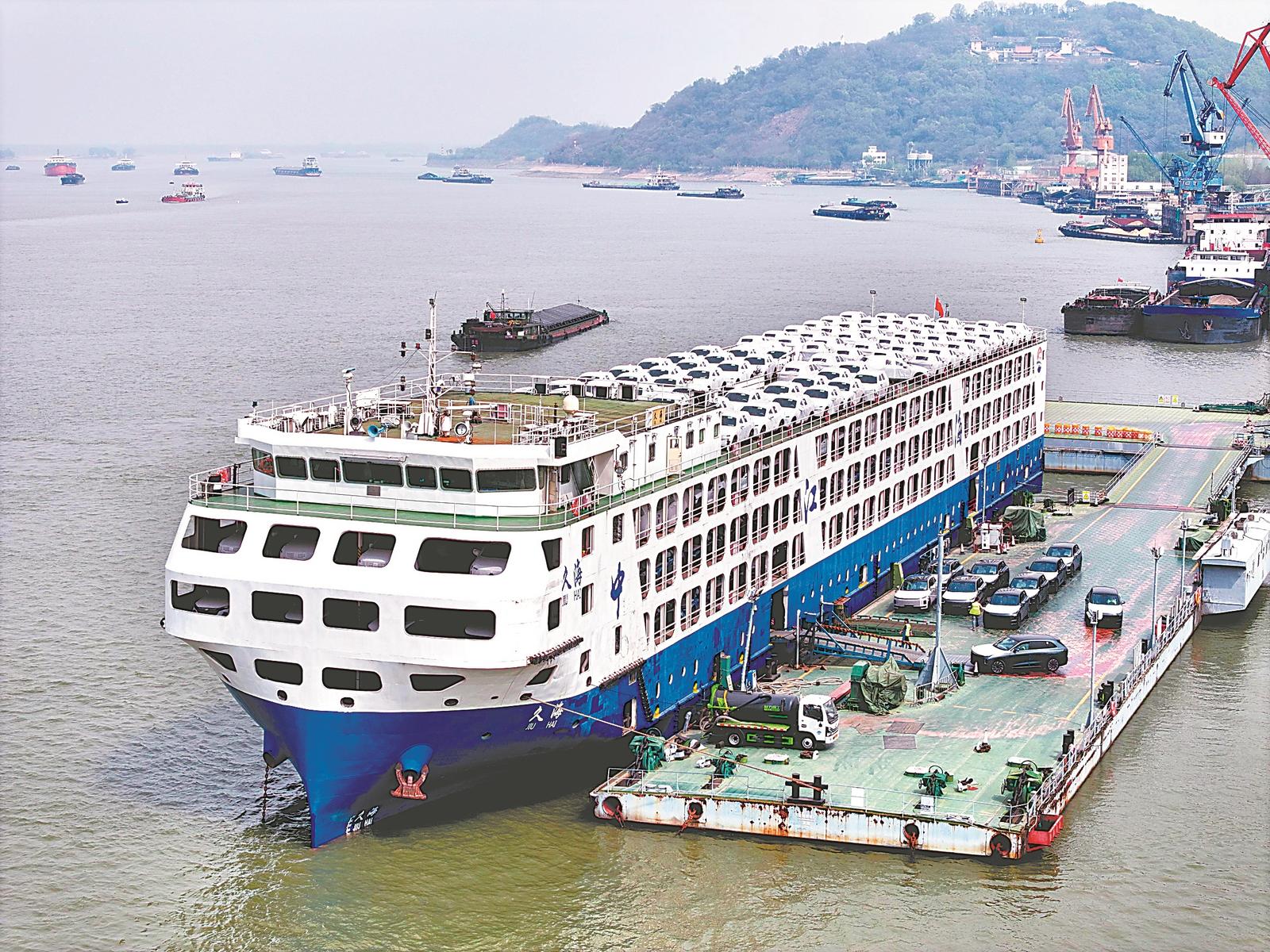 日前,安徽港口集团芜湖港朱家桥港区,货场上的奇瑞集团各品牌汽车整齐地集中停放,滚装货轮正在有序装载汽车,准备销往海外市场。通讯员 王玉实 左家彬 摄
