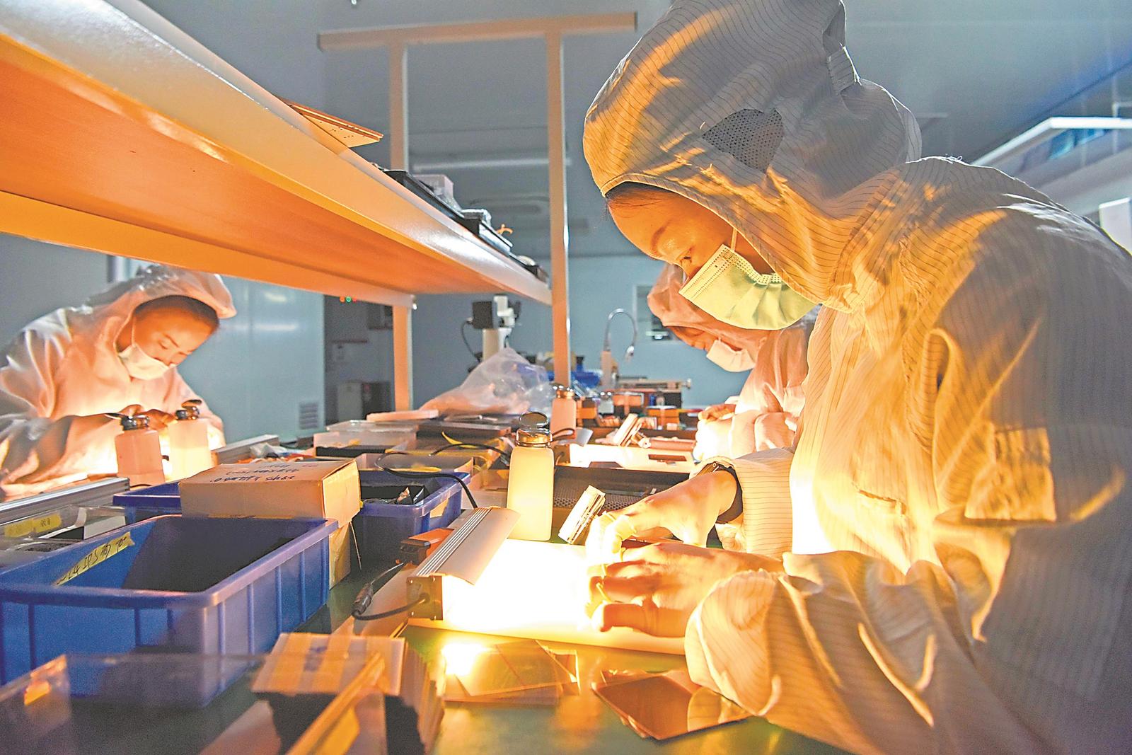 4月14日,淮南市凤台县顾桥镇工业集聚区内,安徽凯晟光电科技有限公司员工加工生产手机屏。淮南市围绕皖北汽车及零部件、新能源、新材料、绿色食品等重点产业集群建设,做大做强县域经济。特约摄影 陈彬 摄