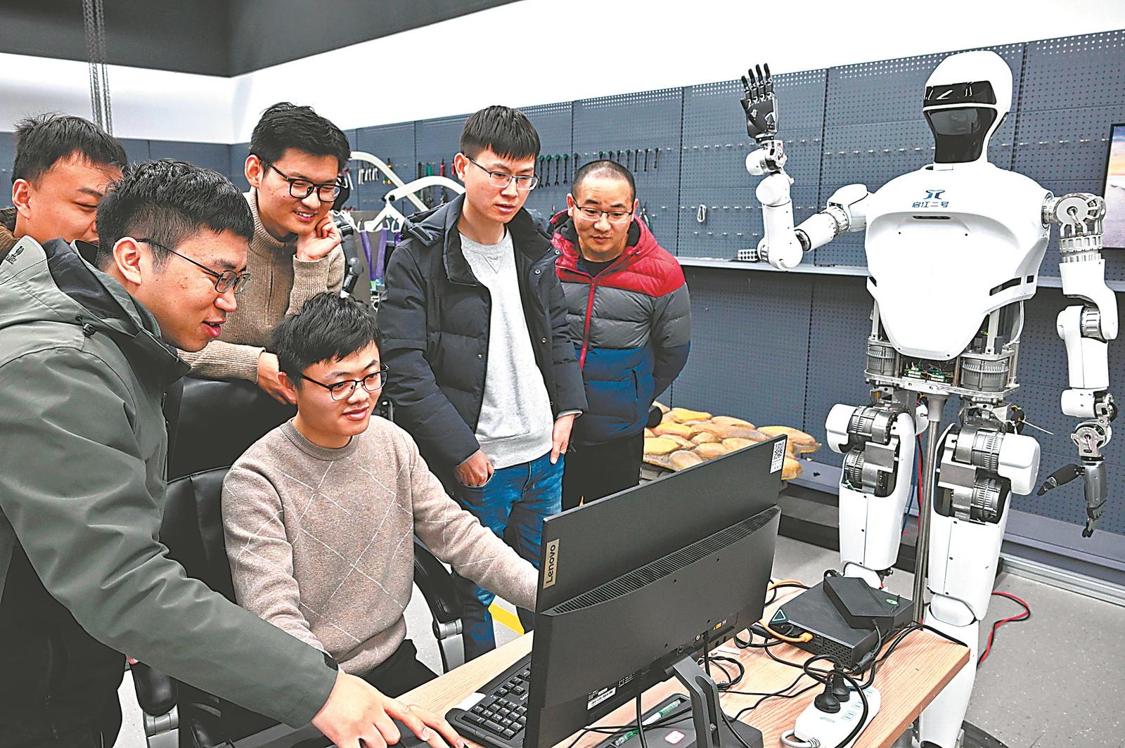 近日,在江淮前沿技术协同创新中心人形机器人研究室,工程师在进行“启江二号”人形机器人的算法调试。记者 程兆 张大岗 摄