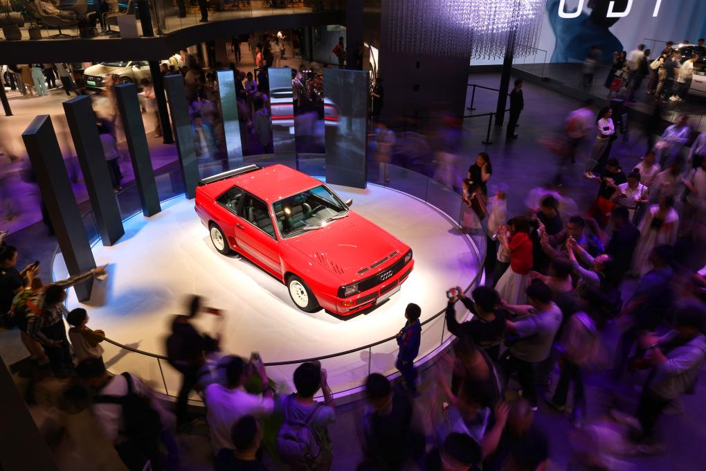 上海,2025年5月1日,参观者在观看奥迪汽车展台。新华社记者 方喆 摄