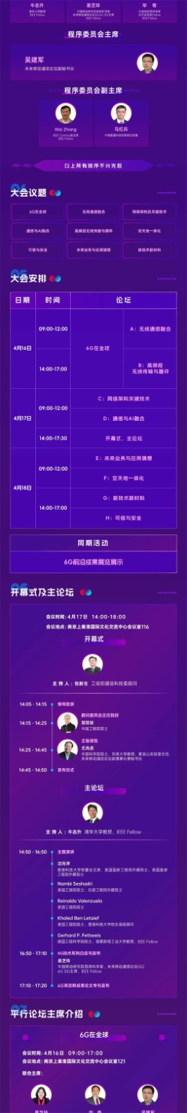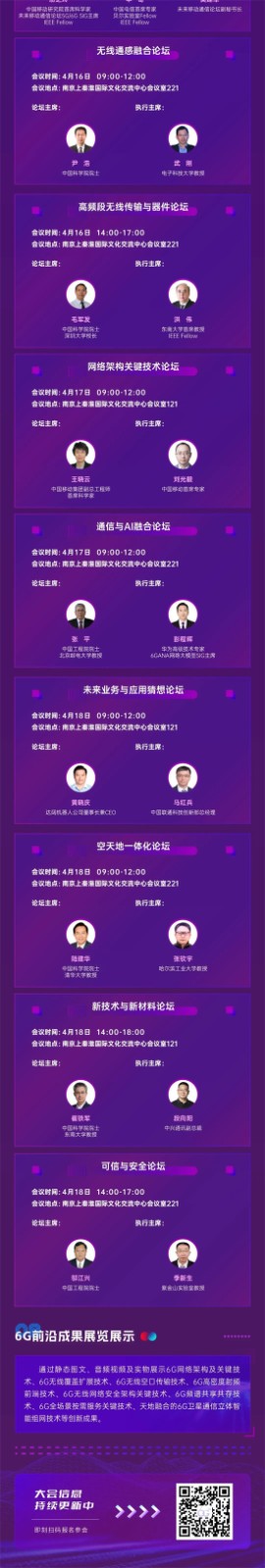 本次大会平行论坛围绕八大前沿方向:通信与AI融合、无线通感融合、空天地一体化、网络架构及关键技术、可信与安全、高频段无线传输与器件、未来业务与应用猜想、新技术新材料,将有来自多个国家的嘉宾参加,汇聚全球智慧,交流分享各国各地区6G发展路线、6G频谱规划、6G新业务和应用、关键技术与创新方向、标准化节奏等内容。