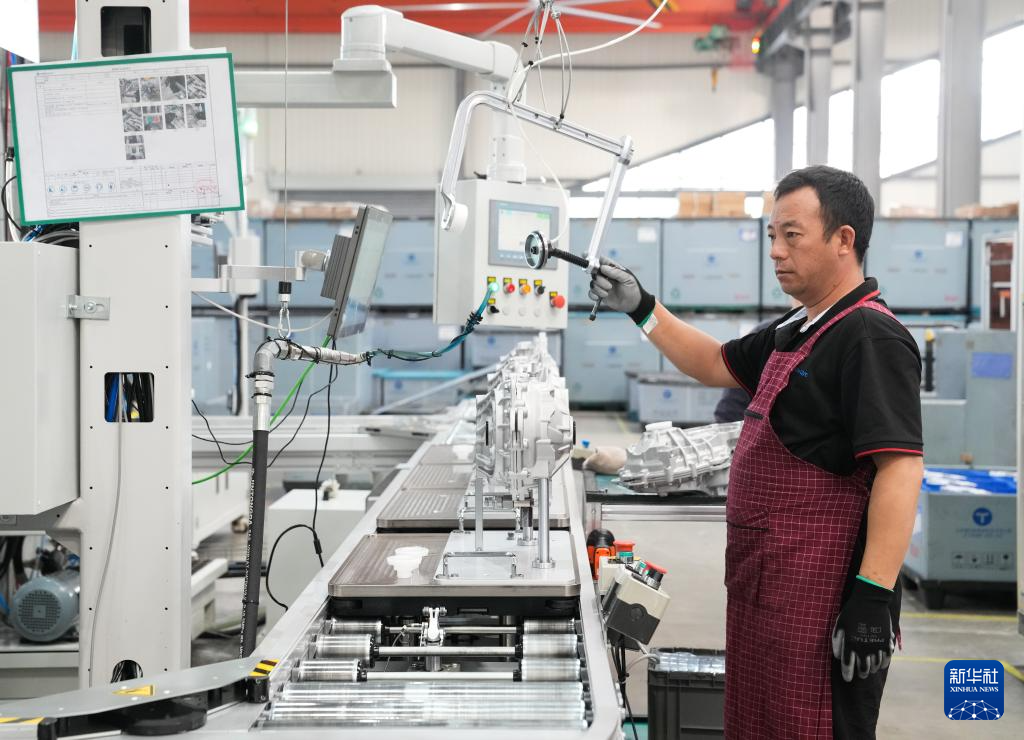 在位于江苏南通如东经济开发区的江苏御传新能源科技有限公司,工人在生产车间内装配新能源汽车传动系统零件(11月2日摄)。