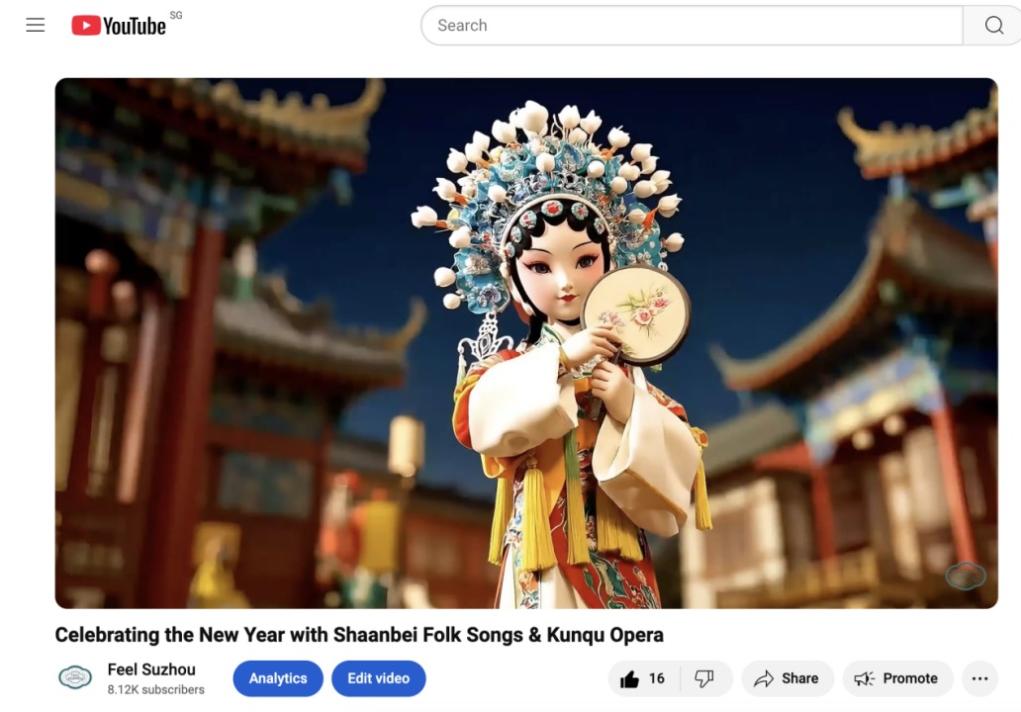 YouTube账号发布页面2024年12月,春节成功申遗,正式跻身联合国教科文组织非物质文化遗产名录。这是对春节文化价值的国际认可,也是中国传统文化“硬核”魅力的全球展示。非遗作为中华民族文化宝库中的瑰宝,是历史的见证,更是现代文旅融合的重要引擎。在《“非”一般的酥年》短剧中,虎丘泥人唱Rap、昆曲和陕北民歌“梦幻联动”,还有苏式园林、苏绣等非遗元素轮番登场,不仅给非遗文化注入了“科技血液”,让传统文化在新时代里“潮”了起来,还通过将苏式美学与AI技术创新融合,让非遗文化“活”起来,更带着苏式年味扬帆出海,让中国传统文化“火”起来。墙内墙外两头香,这是苏州非遗文化的“高光时刻”,更是中国传统文化走向世界的新起点。