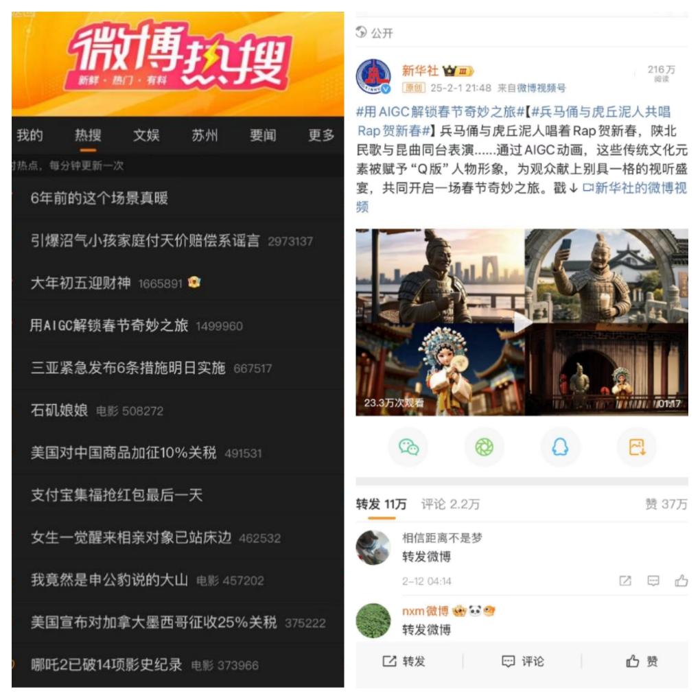 2月1日,新华社官方微博设置话题#用AIGC解锁春节奇妙之旅#、跻身当日热搜前三在此期间,苏州文投通过海内外媒体平台大放异彩,相关融媒体产品强势“出圈”,话题热度一路飙升;海外反响尤为热烈,YouTube平台上发布,AI短剧视频单日点击量破万,1008家海外主流媒体争相转载,覆盖受众高达2.64亿人次,创造了我国非遗文化出海的又一“现象级爆款”。