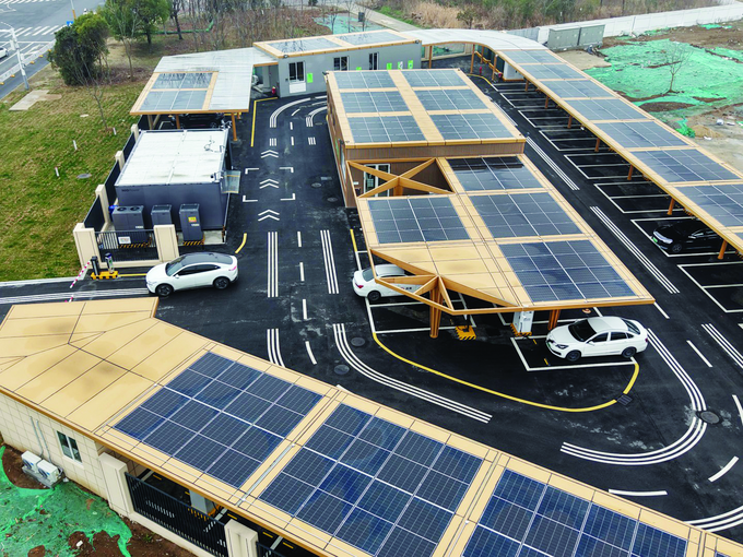 苏南早报网讯 3月12日,南京,航拍投入运营的全市最大全绿电充电站国家电网电动汽车充电站(江宁输电中心微电网示范站充电站),绿色充电和光储充换检模式下,光伏系统、分布式储能设备与新能源车充电、换电、检测集成一体。