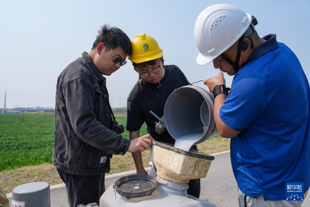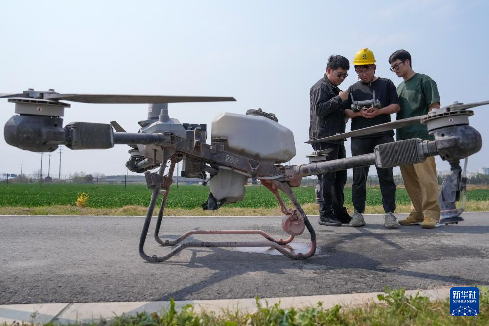 耿博健(左)和农业技术人员在江苏昆山陆家未来智慧田园准备进行无人机施肥(3月26日摄)。