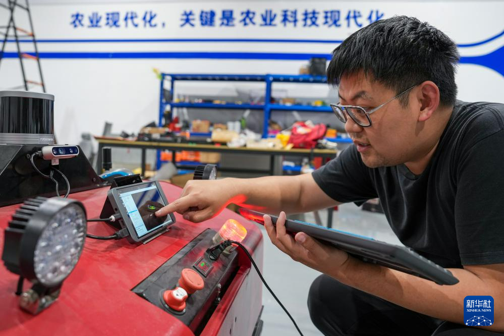 在中国农科院华东中心,耿博健在调试一台无人运输设备(3月26日摄)。