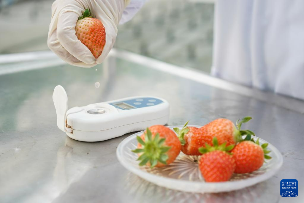 在江苏昆山陆家未来智慧田园“A+温室工场”,史春佳在进行草莓可溶性固形物含量检测(2月26日摄)。