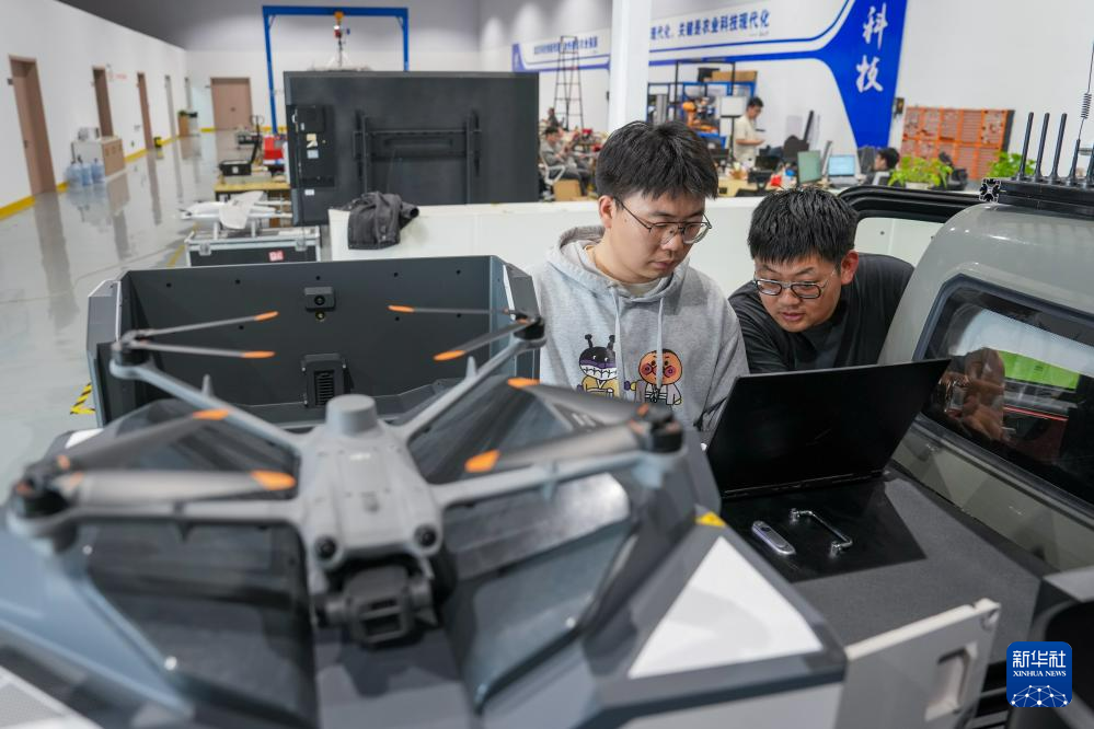 在中国农科院华东中心,耿博健(右)和同事在调试空地一体化遥感监测车(3月26日摄)。