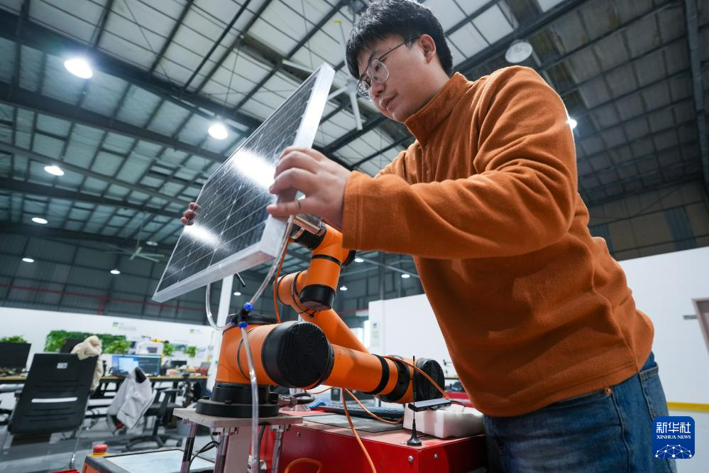 在中国农科院华东中心,工作人员在调试光伏铺装机器人(2月27日摄)。