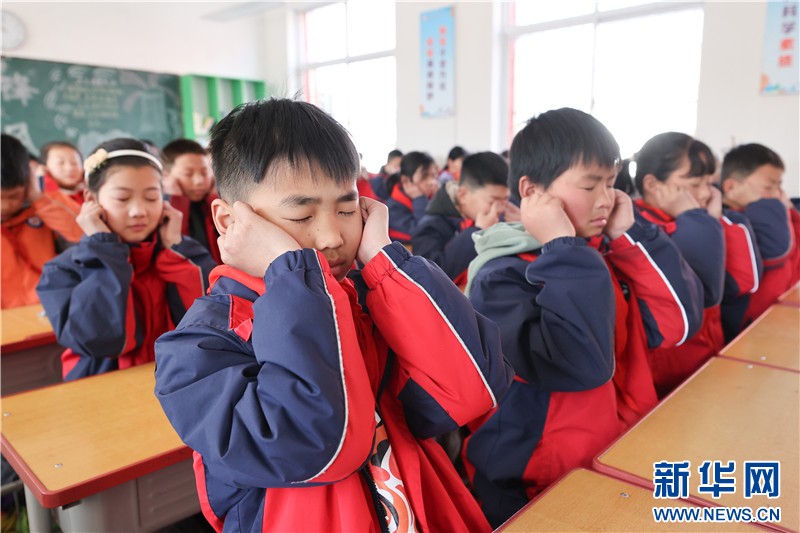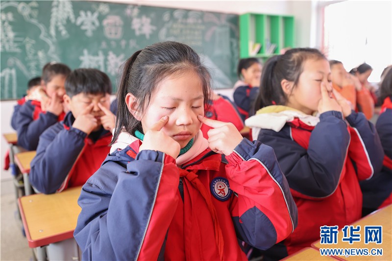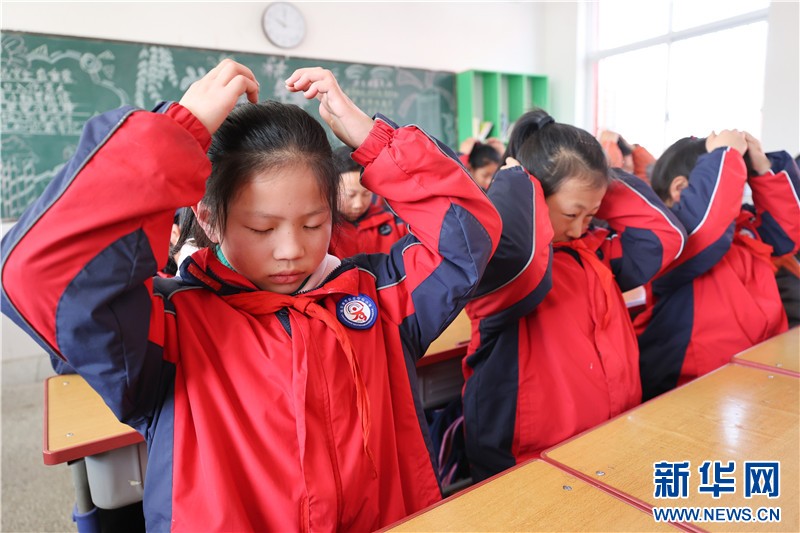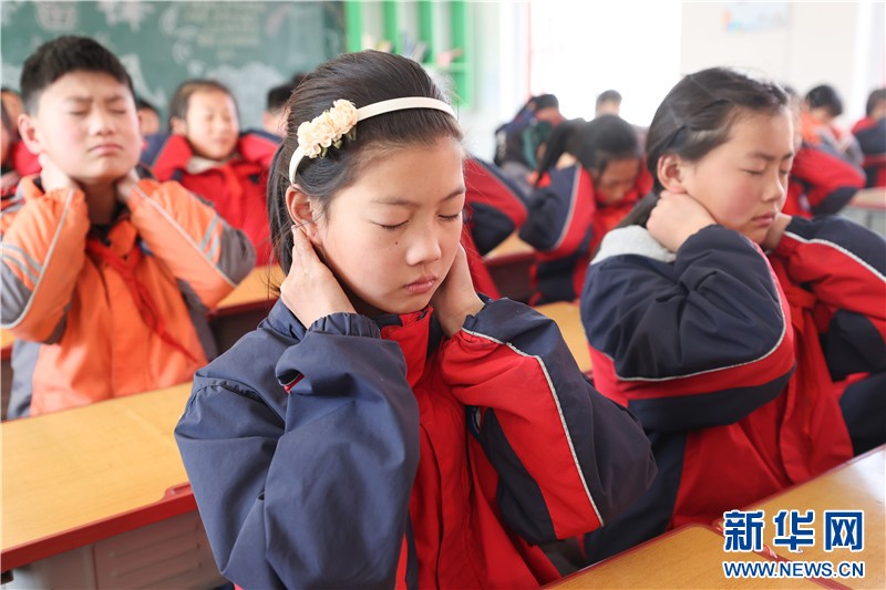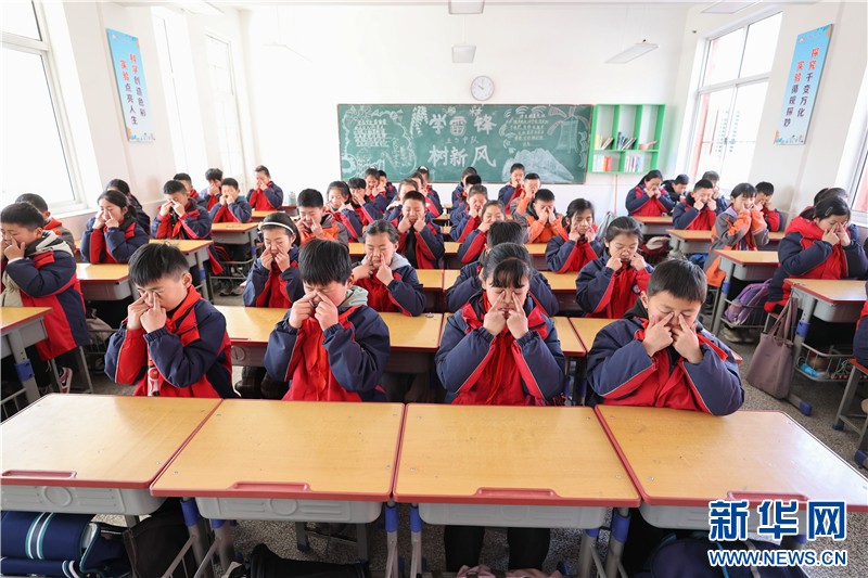 江苏省连云港市厉庄中心小学的学生在做眼保健操