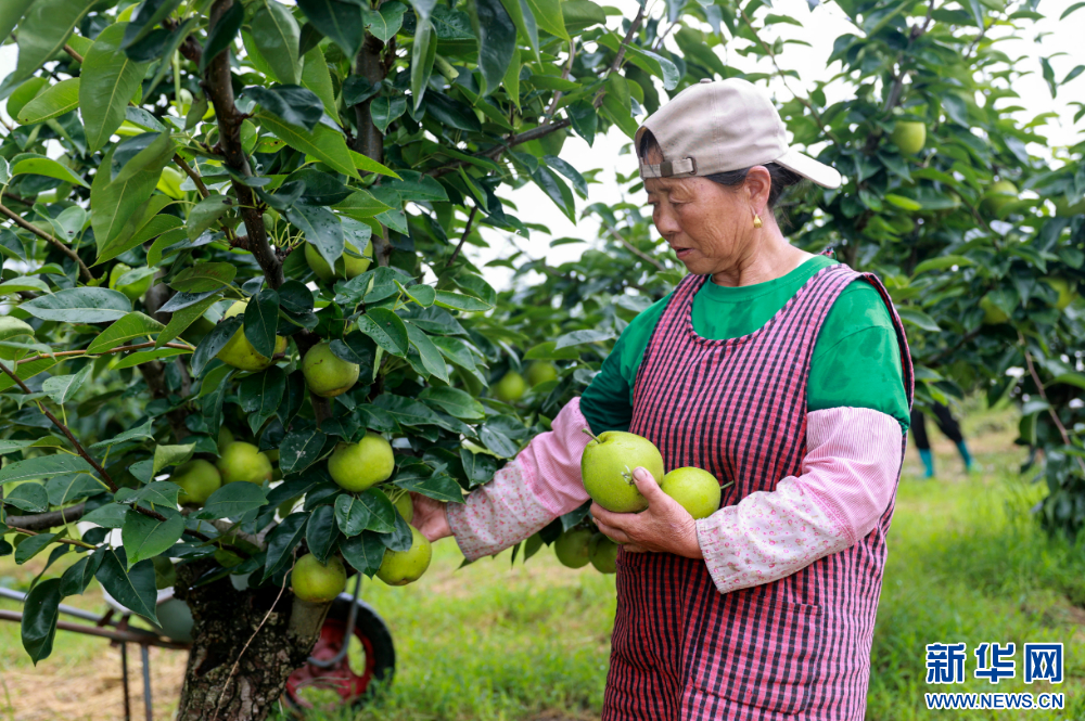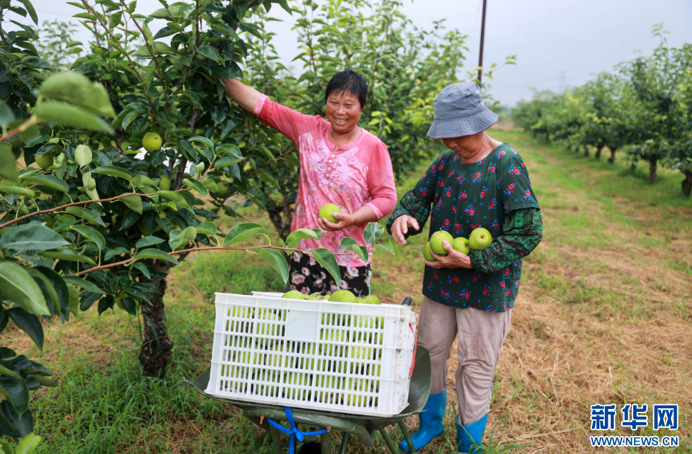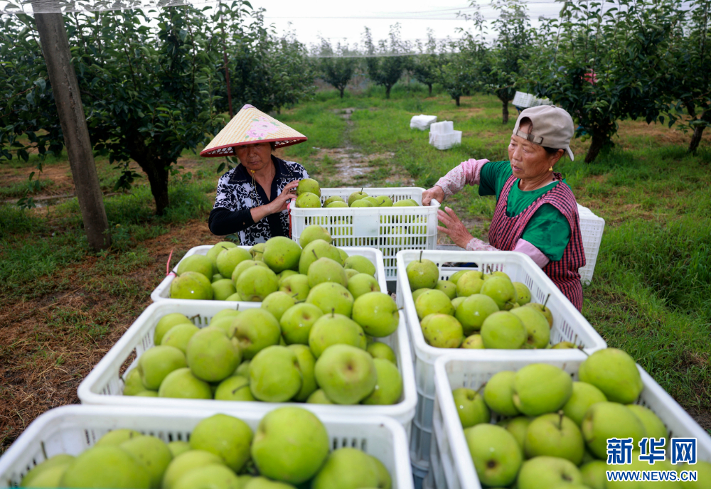 在江苏省泰兴市济川街道王坔果园,梨农在采摘早熟梨。
