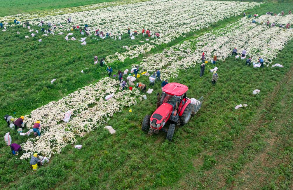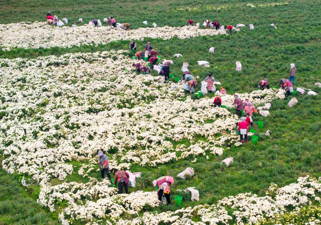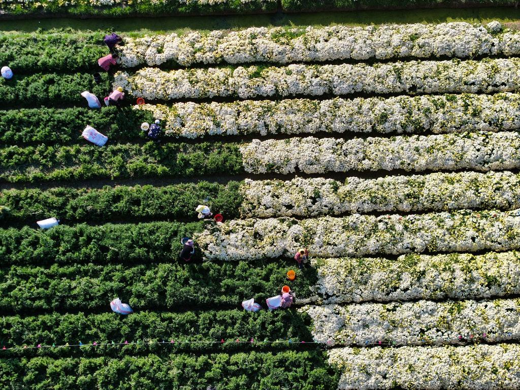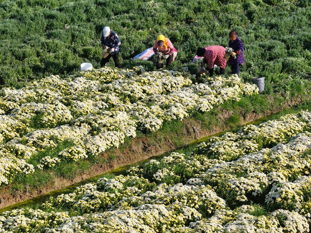 10月26日,农民在射阳县洋马镇药材村田间采收菊花(无人机照片)。