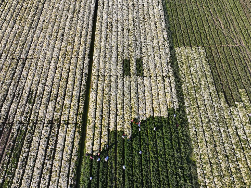 10月30日,射阳县洋马镇贺东村农民在采收菊花(无人机照片)。