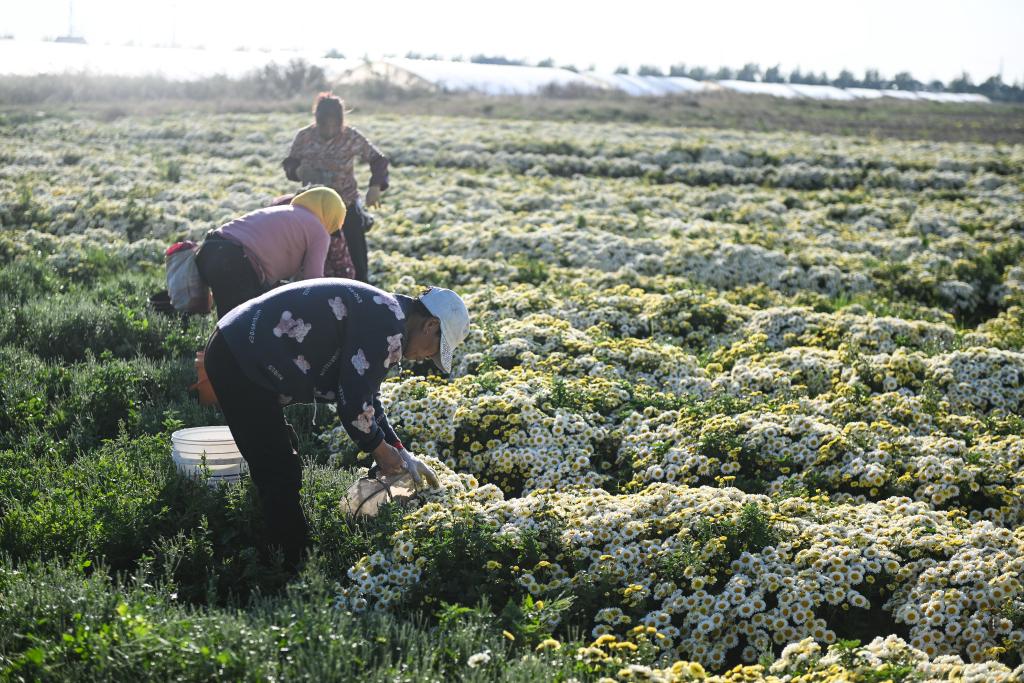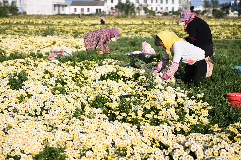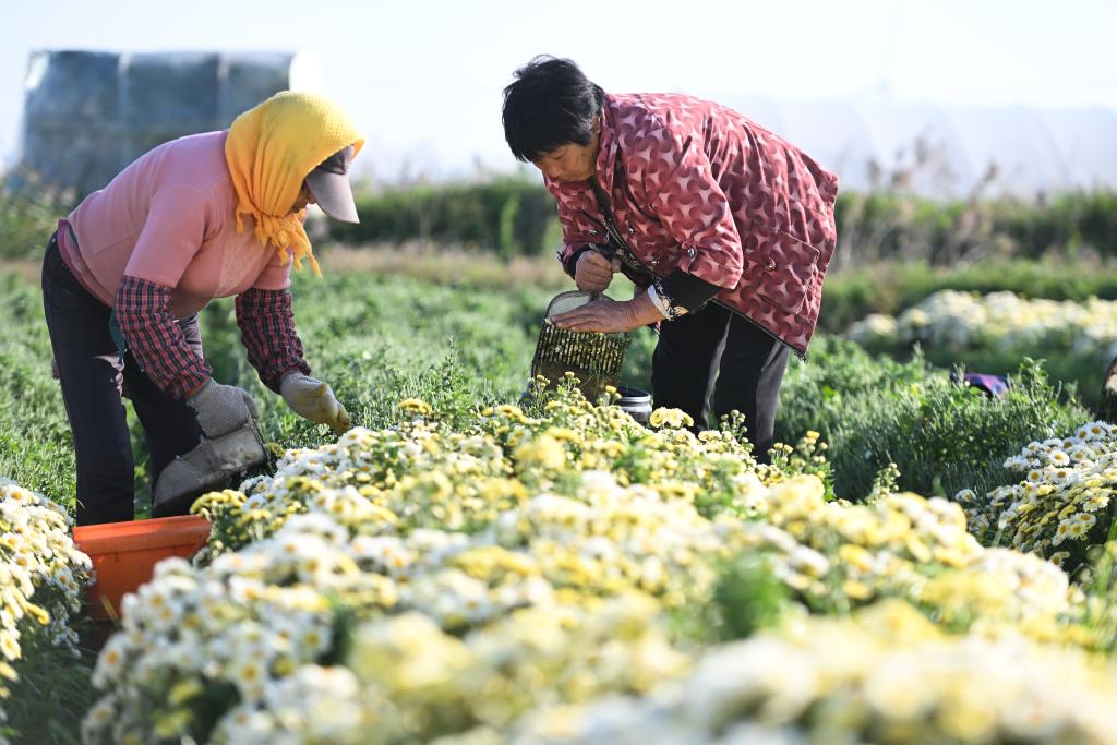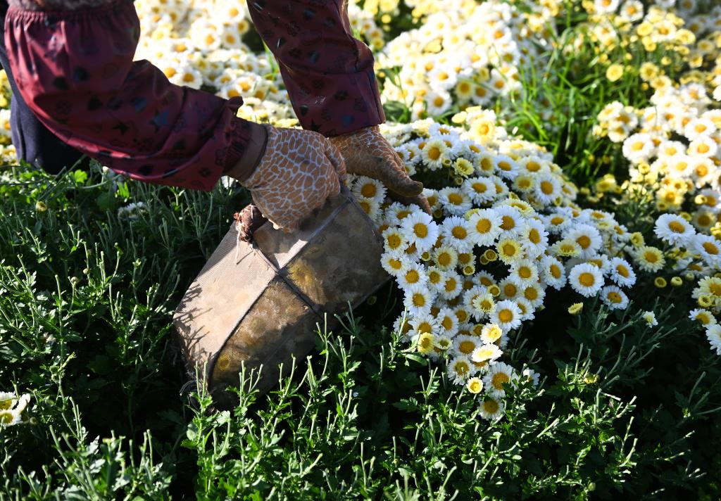 近日,江苏省盐城市射阳县洋马镇种植的菊花进入采摘期,农民趁晴好天气忙着采收,田间地头一派繁忙的秋收景象。