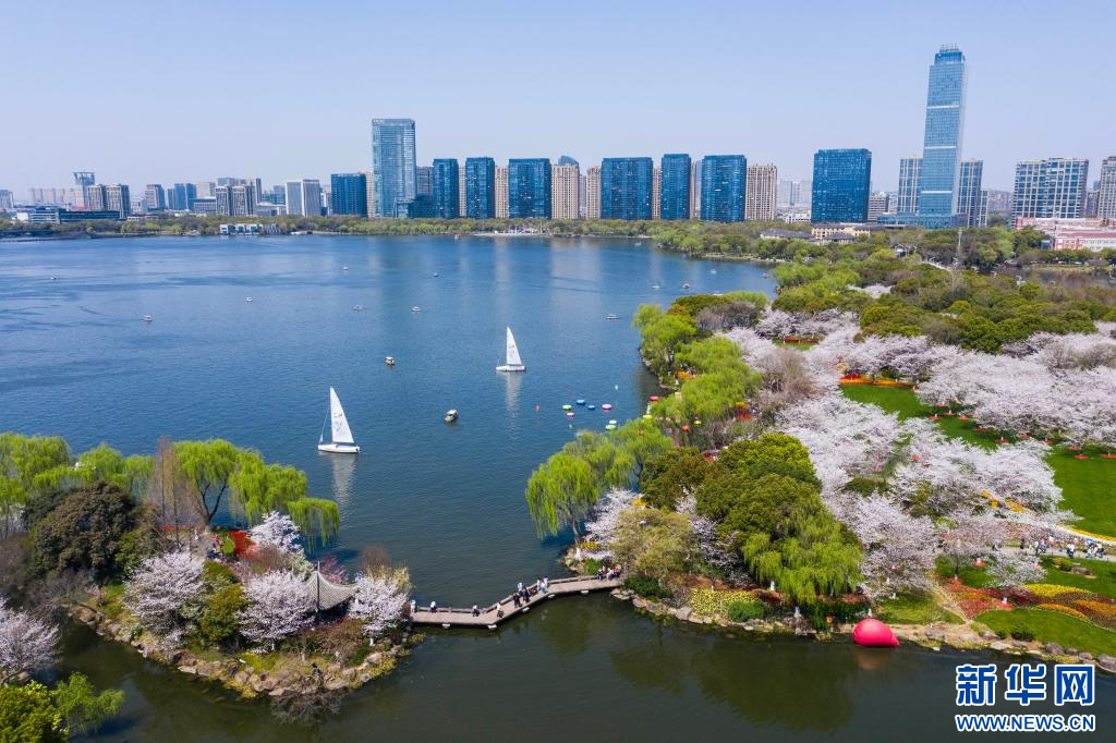 随着近期气温升高,浙江省绍兴市柯桥区瓜渚湖畔的樱花和郁金香大面积盛开,吸引游客前来赏花踏青。新华社记者 徐昱 摄