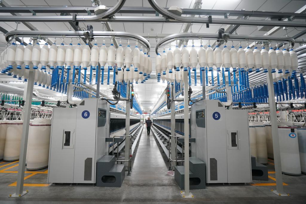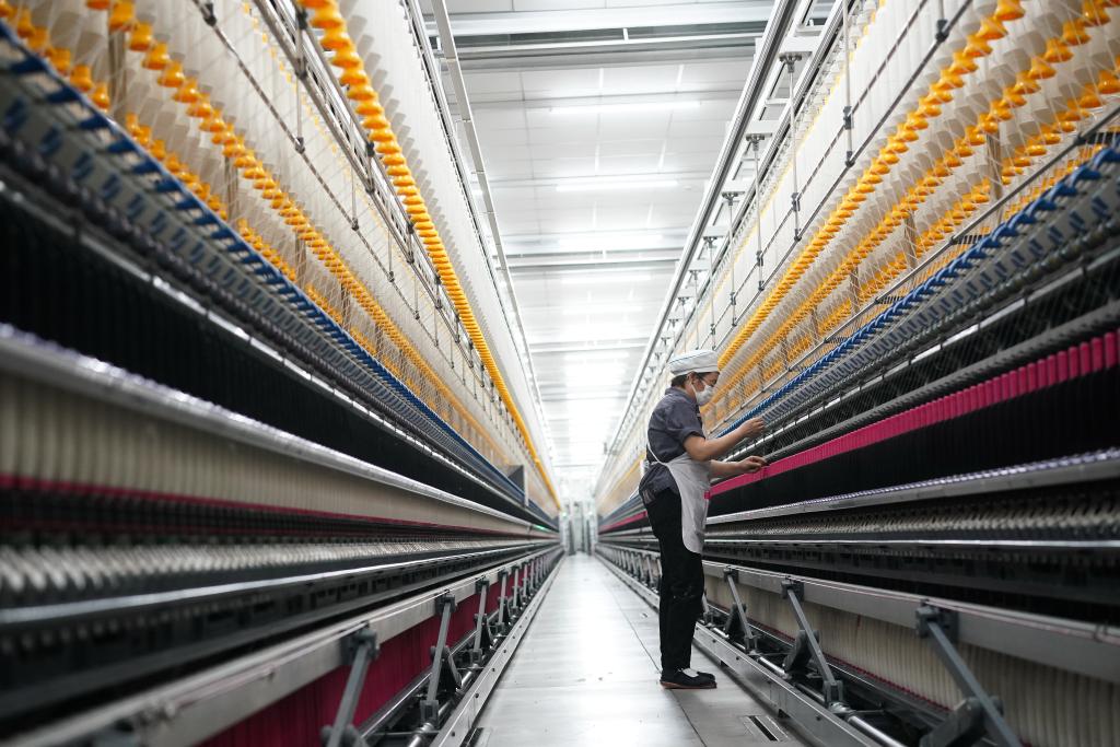 4月5日,工人在江苏泰达纺织科技有限公司智慧化纺纱工厂作业。