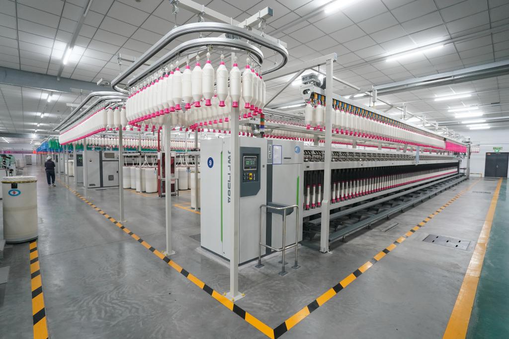 4月5日拍摄的江苏泰达纺织科技有限公司智慧化纺纱工厂生产场景。