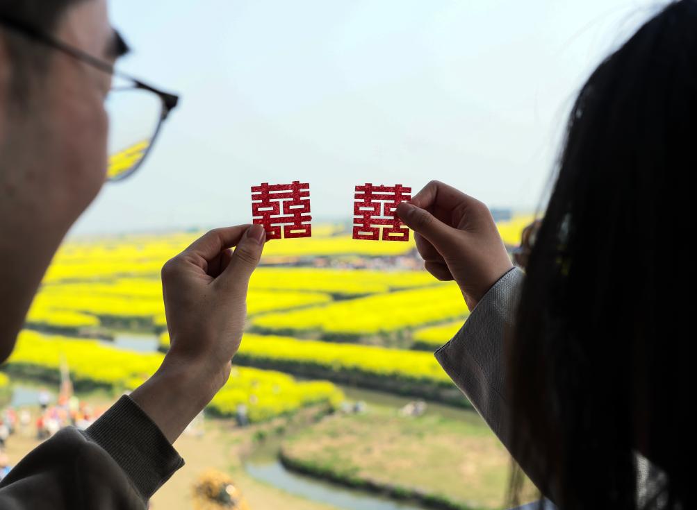 4月5日,来自山东省潍坊市的一对情侣在江苏省兴化市千垛景区的油菜花田留影。