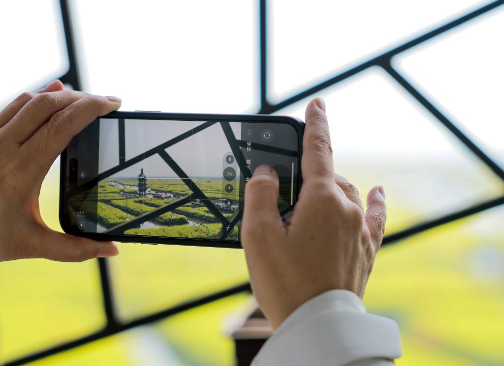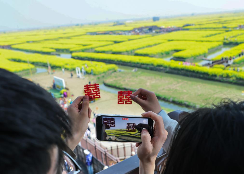 4月5日,一名游客用手机拍摄江苏省兴化市千垛景区油菜花田。