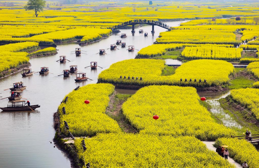 清明时节,江苏省兴化市千垛景区的油菜花进入盛花期,金黄色的油菜花与纵横交错的河道构成“河有万湾多碧水,田无一垛不黄花”的春日画卷,吸引游客前来踏青赏花。新华社发(兰红光摄)