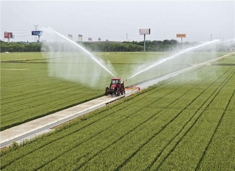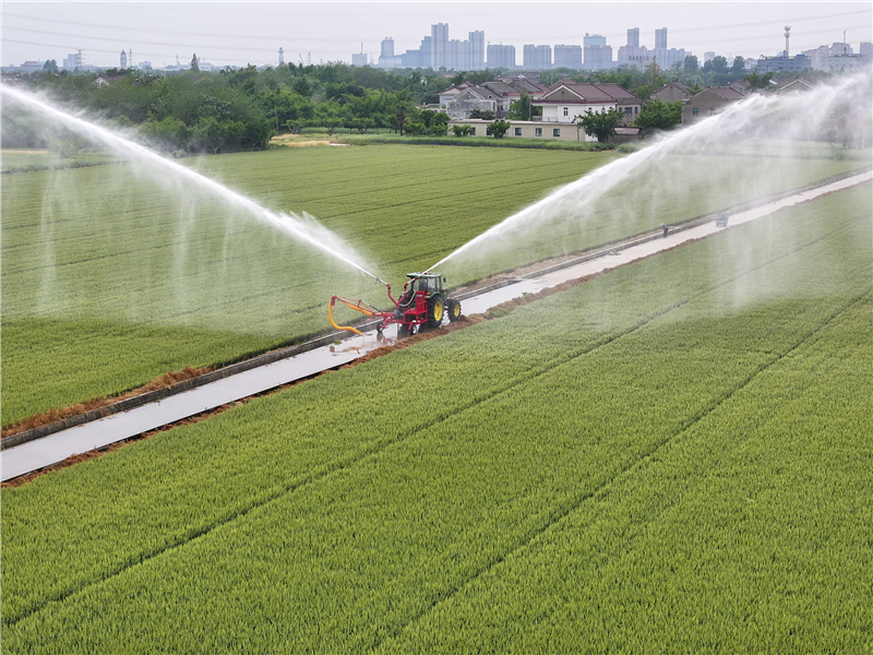 泰州凤栖湖农场工作人员操作喷灌机给小麦田浇水