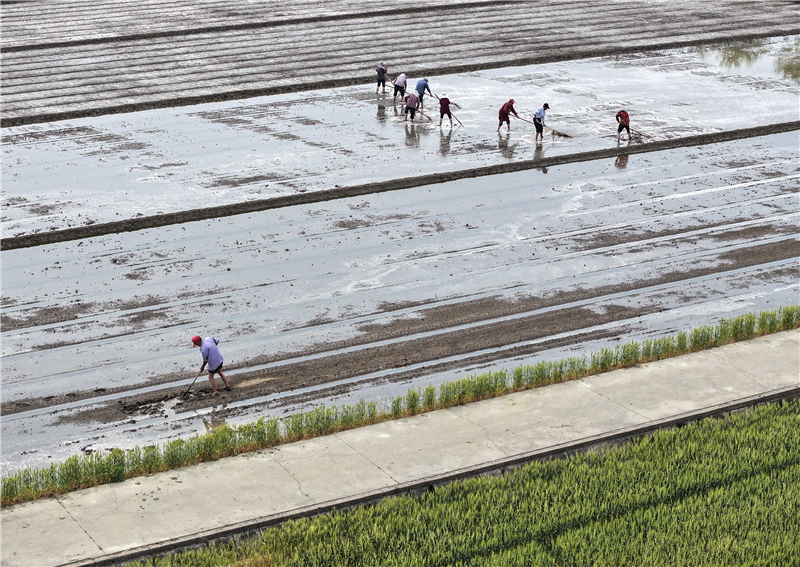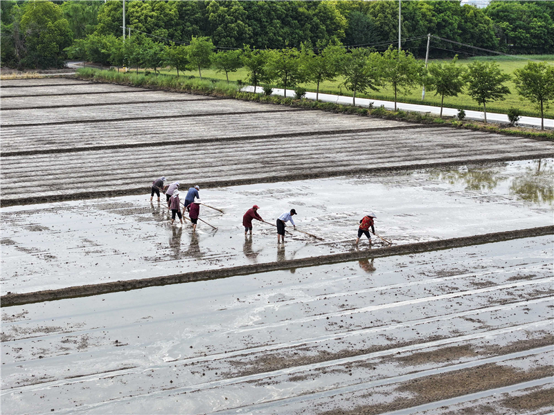 泰州凤栖湖农场工人在平整秧池地