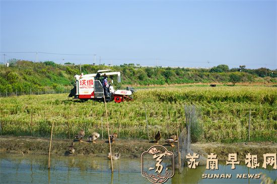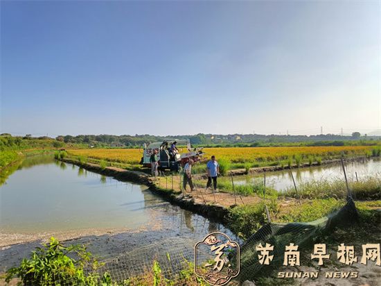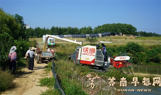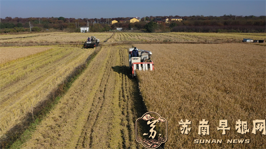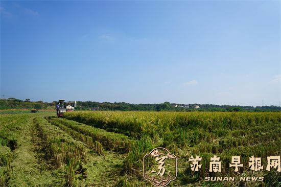 苏南早报讯 金秋十月,稻浪翻滚。10月9日上午,国庆中秋假刚过,句容后白良种场内的收割机早已在稻田穿梭忙碌起来。