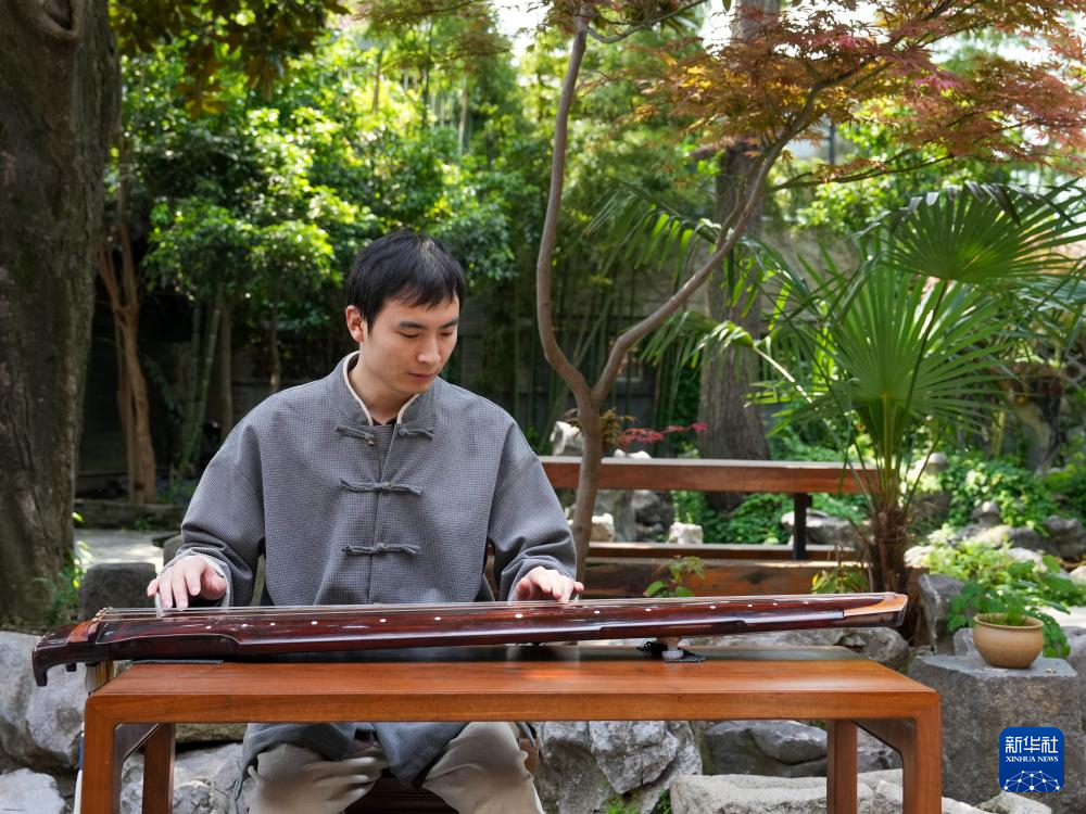 4月22日,古琴老师高廷鑫在扬州仁丰里的永乐琴坊弹奏《梅花三弄》。新华社记者 李博 摄
