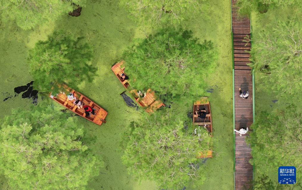 5月26日,游客在江苏省扬州市渌洋湖湿地公园的“水上森林”乘船游览(无人机照片)。