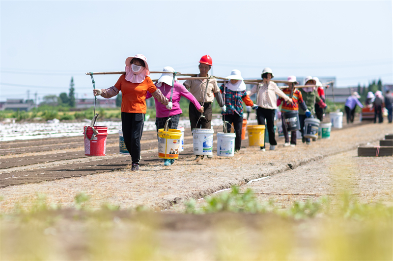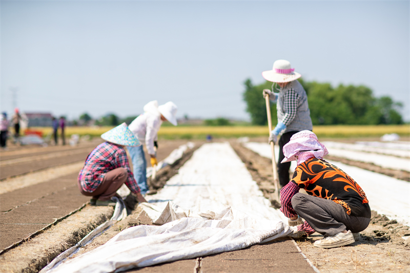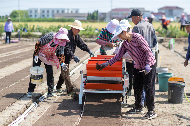 夏播时节,在江苏省兴化市周庄镇边城村,水稻种植户抢抓农时集中育秧,田间一派繁忙的景象,拉开夏播生产的序幕。(沙佳仪 报道员:周社根)