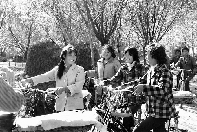 阳光明媚的小村口,4位年轻姑娘每人推着一辆“二八”大杠自行车,龙头上挂着秤,后座架上放着盖有白布的匾篮,浅笑盈盈地走在回村小径上……