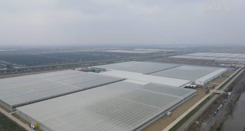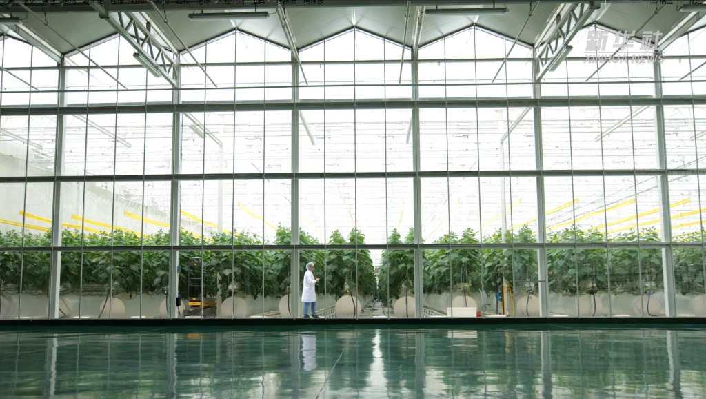 半封闭玻璃温室里,西红柿、黄瓜等蔬菜鲜嫩水灵,生菜等水培叶菜一片生机盎然……